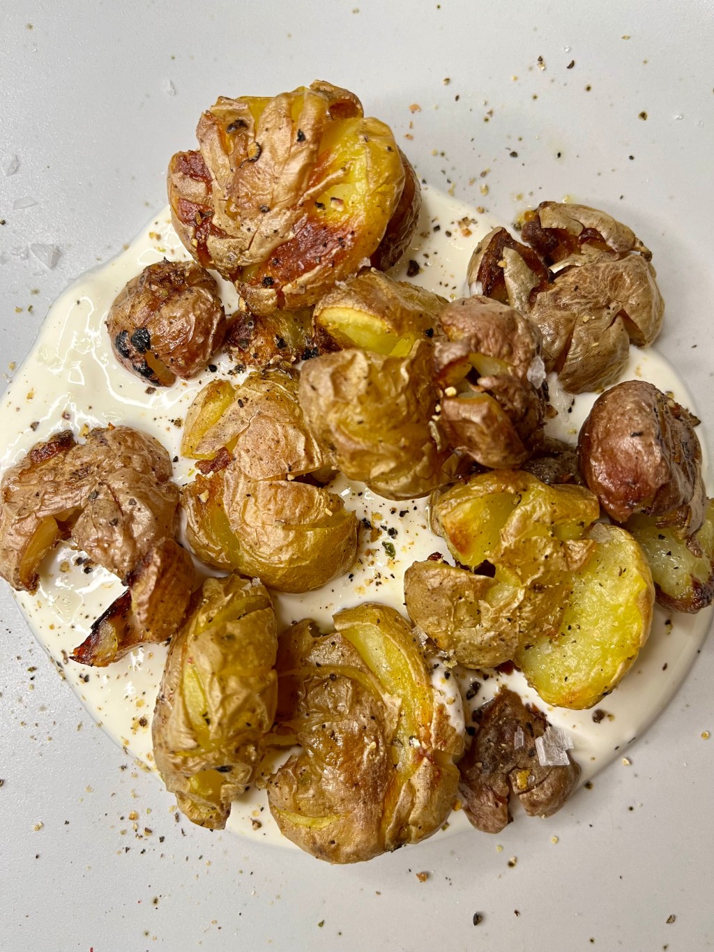 I am cooking my way through Cook This Book this year, and here is recipe #10: Smooshed and Crispy Potatoes with Salt ‘n’ Vinegar Sour Cream. I was excited to try this recipe because Crispy Smashed Potatoes was one of my favorite recipes from Dining In, the book I cooked last year and one our family eats on repeat. The Dining In version is labor intensive – potatoes are boiled, smashed with a water glass, then fried in chicken fat in batches on the stove. In the Cook This Book version, potatoes are also boiled and smashed with a water glass, but then crisped in a hot oven. If this dish could be made a little more hands off, especially at the end, when I am trying to get a whole meal together, great! Also, I love a salt and vinegar potato chip, and Molly’s version is basically the bougie version of salt and vinegar chips. I had visions of serving this as a side to sandwich night, when we usually bust open a bag of Uglies Salt and Vinegar kettle chips.