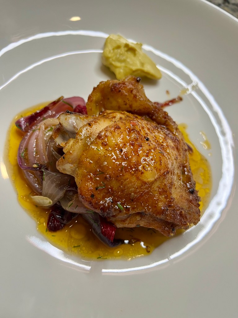 So, rather than a whole chicken, I made pastrami roast chicken thighs. I followed the recipe as written, but used four skin-on, bone-in thighs in a 9×13 casserole dish. Obviously I did not have to cook for as long as the recipe states either. The reviews of this one did not disappoint – this was delicious! My husband and I ate the chicken thighs with mustard the first night, and I cut up the other two chicken thighs to eat as a chicken sandwich the next night. I thought the chicken was best on the first night – the sandwich did not really work out well.