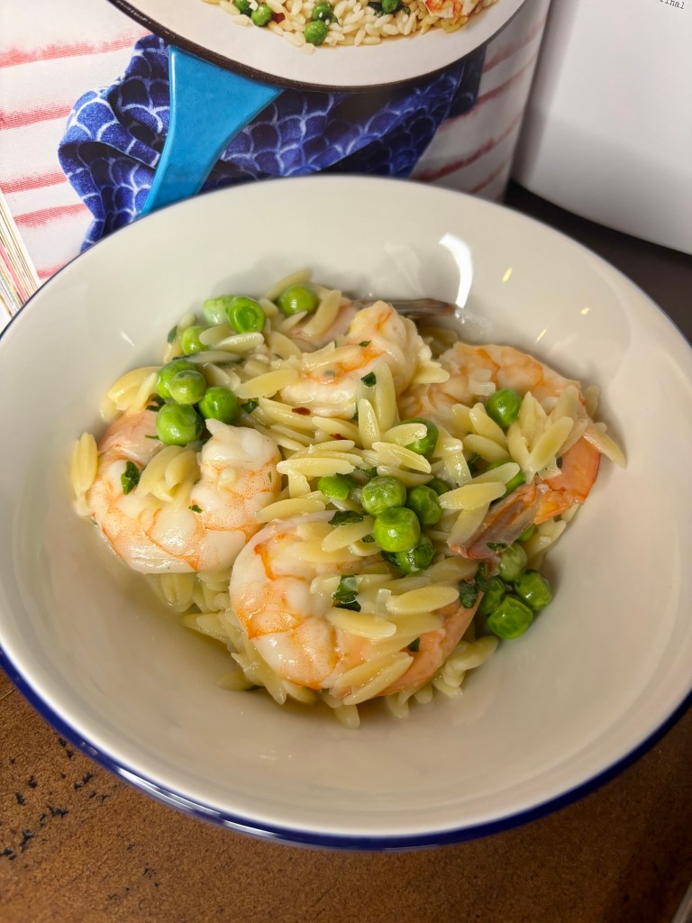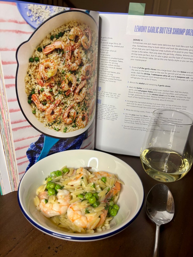 Now it’s time to cook! What recipe will it be? After entering a range of 1 to 110 in my random number generator, I get 31, which corresponds to “Lemony Garlic Butter Shrimp Orzo”, a title that just sounds, frankly, classic and delicious. In short, this is a one-pot meal with orzo and marinated shrimp steaming together in a Dutch oven-type of vessel. Some green in the form of basil and peas are added at the very end, along with a good grating of Parmesan. There are few ingredients and few pieces of equipment. Love it.